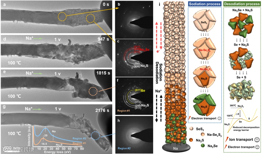 图4. a-h)100 ℃下,Na-SeS2的去钠化过程(a,d,e,g)及其相应的SAED结果(b,c,f,h);i)原位透射电镜结论概括。