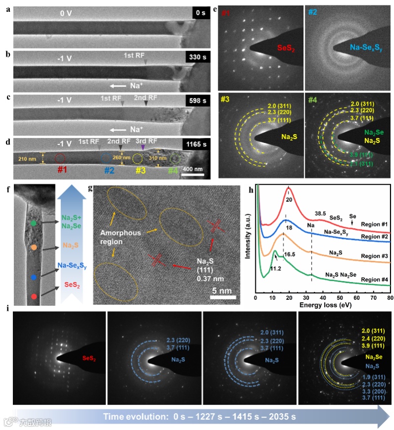 图2. a-d)Na-SeS2的随时间原位钠化转变过程;e)图d中四个区域的电子衍射花样;f)SeS2具体钠化过程的示意图;g)图d中黄色区域的HRTEM结果;h)图d中四个区域的EELS曲线;i)Na-SeS2的原位SAED 结果。
