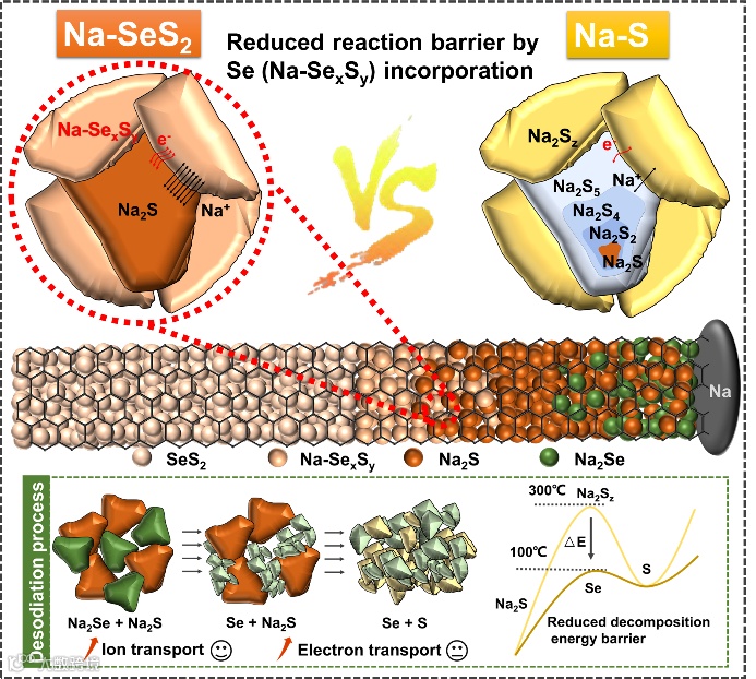 全固态(ASS)钠硫电池的固态电解质层可有效消除传统钠硫电池中的“穿梭效应”,降低钠硫电池因循环造成的活性物质损耗。但由于硫的本征离子/电子电导极低,形成高反应势垒从而限制其应用。Se作为S的同主族元素,与S的物化特性相似,但具有更高离子/电子电导,因此Se经常被引入S正极改善正极反应动力学性能。