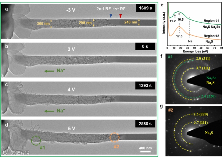 图3. a-d)常温下,Na-SeS2的随极化电压的增加的去钠化过程;e)图d中两个区域的EELS曲线;f,g)图d中两个区域的电子衍射花样。