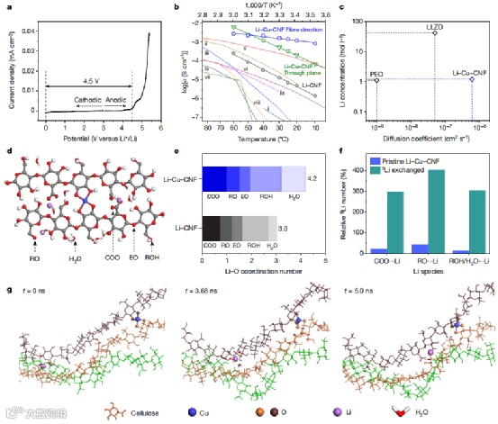 改性可以维持较大的链间距,有助于锂离子高速运输。图3c中,纤维素电解质膜与LLZTO电解质具有同数量级的离子导电率,锂离子浓度仅为LLZTO电解质的十分之一,而且锂离子扩散系数高于LLZTO一个数量级。图3d中,纤维素电解质膜中的锂离子运动主要来自于Li-O键之间的传递,其中Cu与Li的摩尔比为1:6。相对于未经过Cu