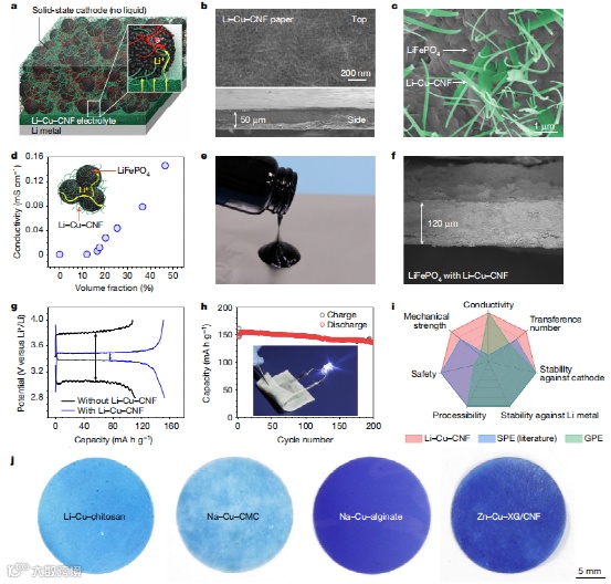 图四 (a)全固态电池的组装示意图,(b)纤维素膜电解质的SEM表征,(c)正极材料与导锂纤维素的混合,(d)正极材料与导锂纤维素混合后的离子导电性,(e)混合正极浆料数字图片,(f)全固态电池正极的截面SEM表征,(g)全电池的恒流充放电曲线,(h)全电池在0.2 C倍率下的循环性能,(i)导锂纤维素电解质与其他聚合物电解质的性能对比,(j)不同离子导电的多种聚合物电解质的数字图像。