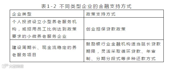 内容:“金融机构要加快金融产品和服务方式创新,拓宽信贷抵押担保物范围,积极支持养老服务业的信贷需求。积极利用财政贴息、小额贷款等方式,加大对养老服务业的有效信贷投入。