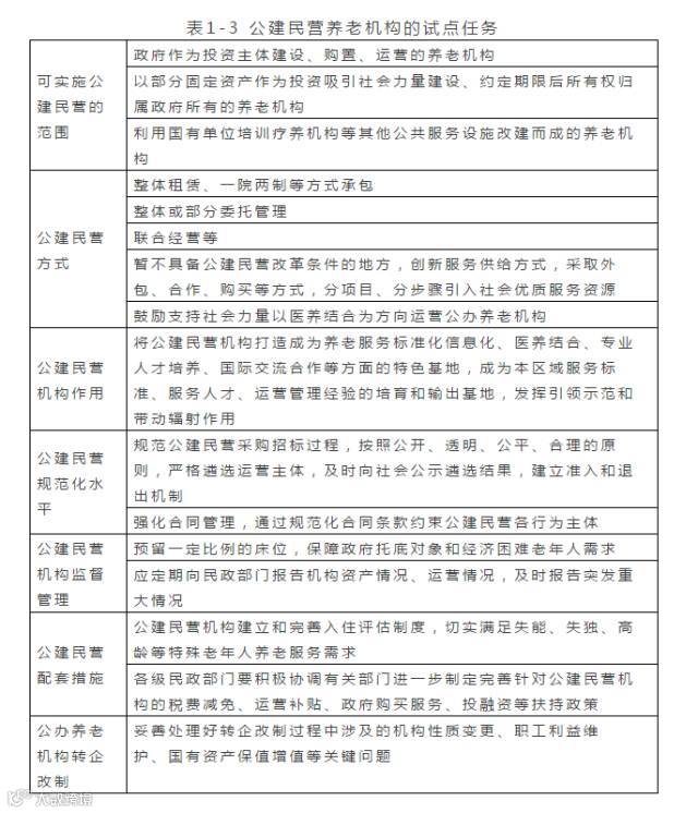 内容:“政府投资兴办的养老床位应逐步通过公建民营等方式管理运营,积极鼓励民间资本通过委托管理等方式,运营公有产权的养老服务设施。”