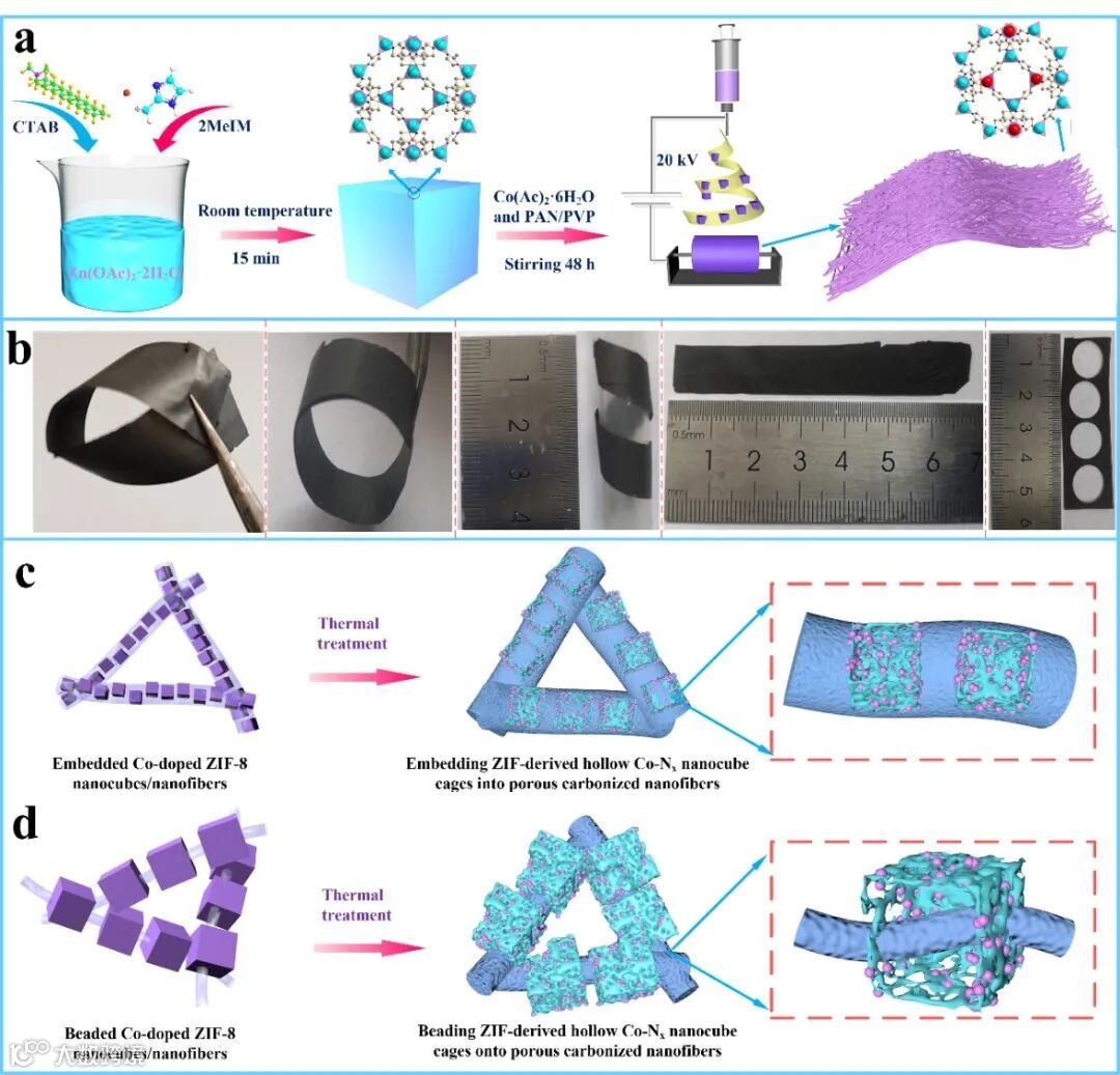 导读:本文通过静电纺丝和退火将 ZIF 衍生的空心 Co-Nx 纳米立方笼嵌入或串珠式植入多孔碳化纳米纤维