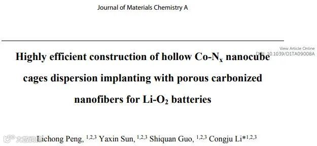 在这里,来自北京科技大学的博士生彭利冲,在国际知名期刊Journal of Materials Chemistry A上发表题为“Highly efficient construction of hollow Co-Nx nanocube cages dispersion implanting with porous carbonized nanofibers for Li-O2 batteries”文章。