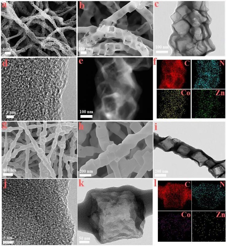 图2(a,b)EH/PCNFs的图像;(c) EH/PCNFs的TEM和(d)HRTEM图像;(e) 扫描TEM和(f)对应的元素图对应的元素图。(g,h)BH/PCNFs图像;(i) BH/PCNFs的TEM和(j)HRTEM图像;(k) 扫描TEM和(l)对应的元素图对应的元素图