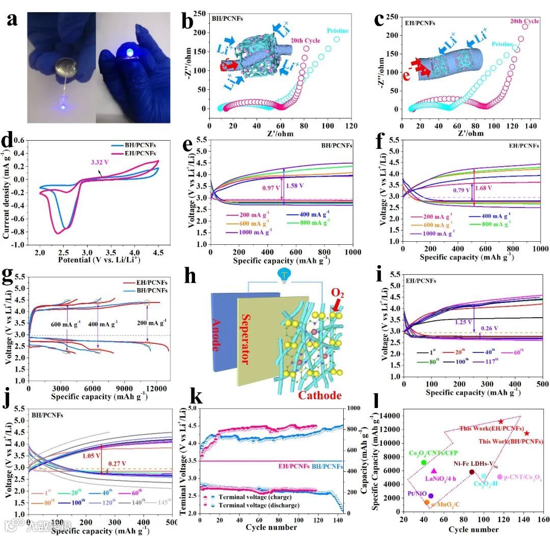 图3(a) LED灯被LOBs成功点亮;(b-c)电化学阻抗谱;(d) 循环伏安曲线;(e-f)放电-充电电压曲线;(g) 不同电流密度下BH/PCNFs和EH/PCNFs电极的初始深放电-充电曲线;(h) 基于EH/PCNFs或BH/PCNFs的LOBs模型;(i-j)循环性能;(k) 终端放电充电电压分布;(l)工作比较