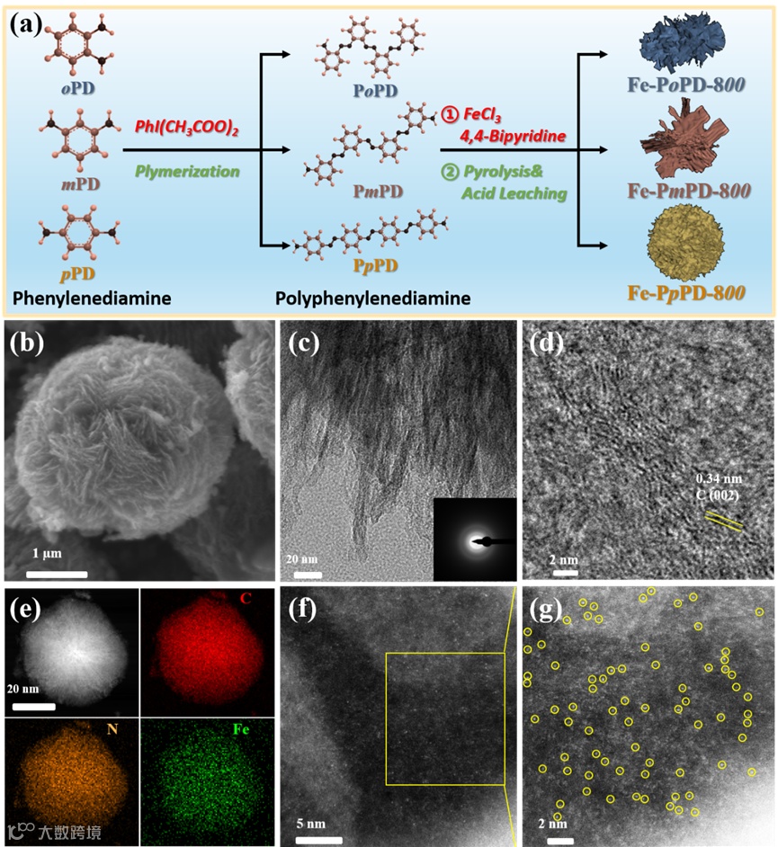 图 1. (a) Fe-PoPD-800、Fe-PmPD-800和Fe-PpPD-800催化剂的合成过程示意图; (b) Fe-PpPD-800样品的SEM图像; (c) Fe-PpPD-800样品的TEM图像,插图:SAED图案; (d) Fe-PpPD-800样品的HRTEM图像; (e) HAADF-STEM图像和相应的EDS元素映射; (f,g)像差校正HAADF-STEM图像.