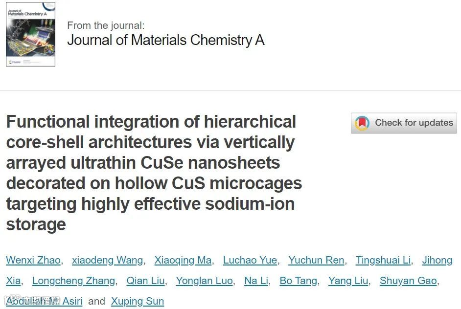 基于此,来自电子科技大学的孙旭平教授团队在国际知名期刊Journal of Materials Chemistry A上发表题为“Functional integration of hierarchical core-shell architectures via vertically arrayed ultrathin CuSe nanosheets decorated on hollow CuS microcages targeting highly effective sodium-ion storage”文章。