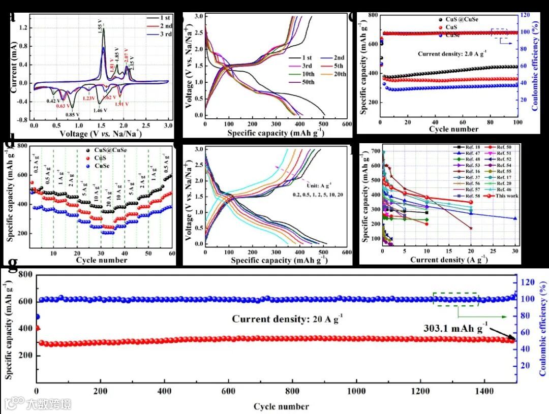 通过电化学测试发现,相较于单相的CuS和CuSe材料,核壳空心CuS@CuSe微米块具有最大的比容量、最优的循环稳定性及倍率性能。在20.0 A g-1的超高电流密度下循环1500圈后,其容量仍然高达303.1 mAh g-1,其每圈的容量衰减率为0.02%。