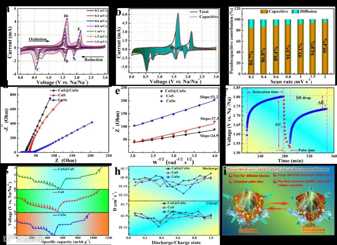 此外通过不同扫速下的CV曲线并结合GITT及EIS测试分析可知,核壳空心CuS@CuSe微米块相比于单相的CuS和CuSe材料具有更大的赝电容贡献比例,更优的钠离子扩散系数及离子传输速率。