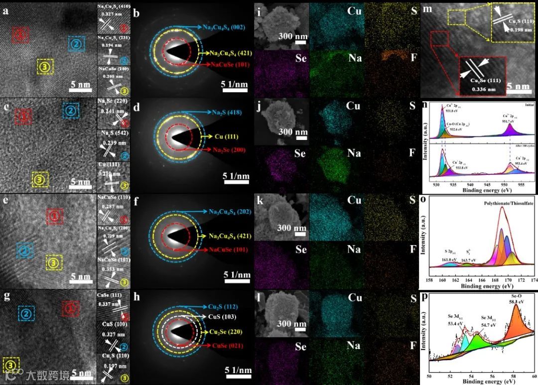 随着放电过程的深入,Na3Cu4S4和NaCuS被转换为了Cu, Na2S和Na2Se, 同时伴随有Cu2S和Cu2Se的出现,该过程在充电过程是不可逆的。在放电过程中,反向的转换和插层过程同样也被检测到,但是由于终产物CuS和CuSe糟糕的结晶度,并没有发现其相关的衍射峰。非原位的TEM和SEM进一步证明了上述结果。