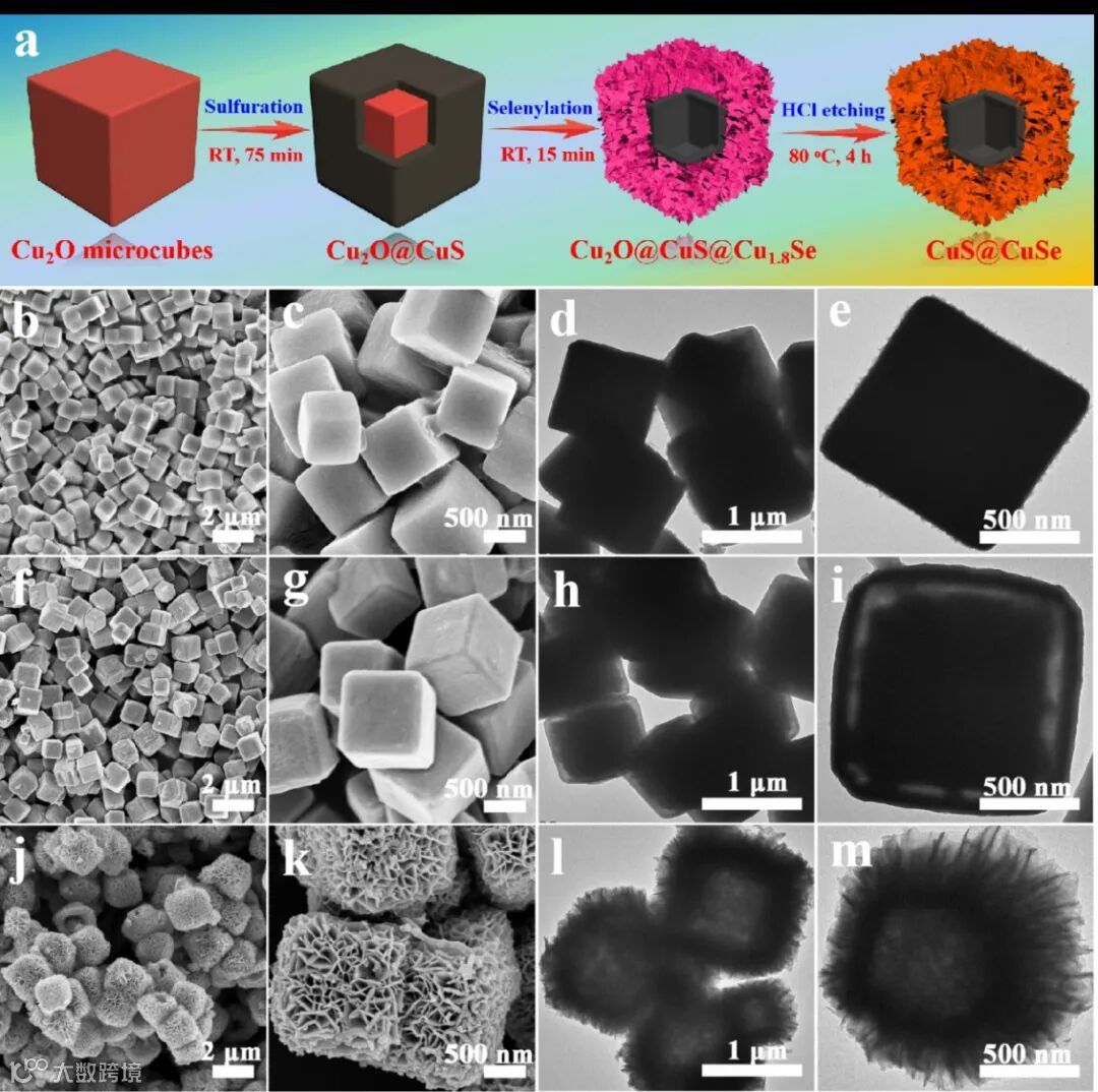 导读:本文以Cu2O纳米方块为模板,在室温下通过快速的异步硫化与硒化策略获得了超薄CuSe纳米片修饰CuS微米笼的空心异质结构