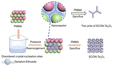 使用密集堆积的PMMA球体构建纳米反应器的壁,纳米反应器空间受限于 PMMA球体的间隙。作为前体的乙醇钽从纳米反应器的边缘逐渐填充整个空间。由于乙醇盐和PMMA模板的良好亲和力,晶体成核位点均匀分布在纳米反应器中。通过真空抽滤对纳米反应器施加压力,使得纳米反应器中的晶体成核位点长程有序排列。晶体的外延生长受到有限的晶体成核位点、压力和限制的纳米反应器空间的影响。