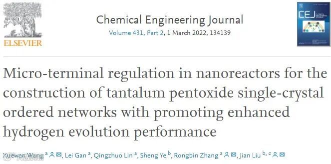 基于此,来自南昌大学的王学文教授、张荣斌教授和中科院大连化学物理研究所的刘健研究员合作,在国际知名期刊Chemical Engineering Journal上发表题为“Micro-terminal Regulation in Nanoreactors for the Construction of Tantalum Pentoxide Single-crystal Ordered Networks with Promoting Enhanced Hydrogen Evolution Performance”的观点文章。