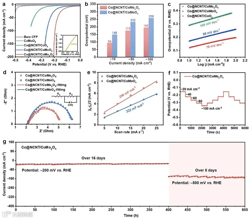 具体而言,Co@NCNT/CoMoyOx在−10 和−100 mA cm-2 下分别具有94和195 mV 的过电位,同时,该催化剂能在−200 mV vs. RHE的固定电压下稳定工作400小时后在−500 mV vs. RHE的固定电压下继续稳定工作200小时。