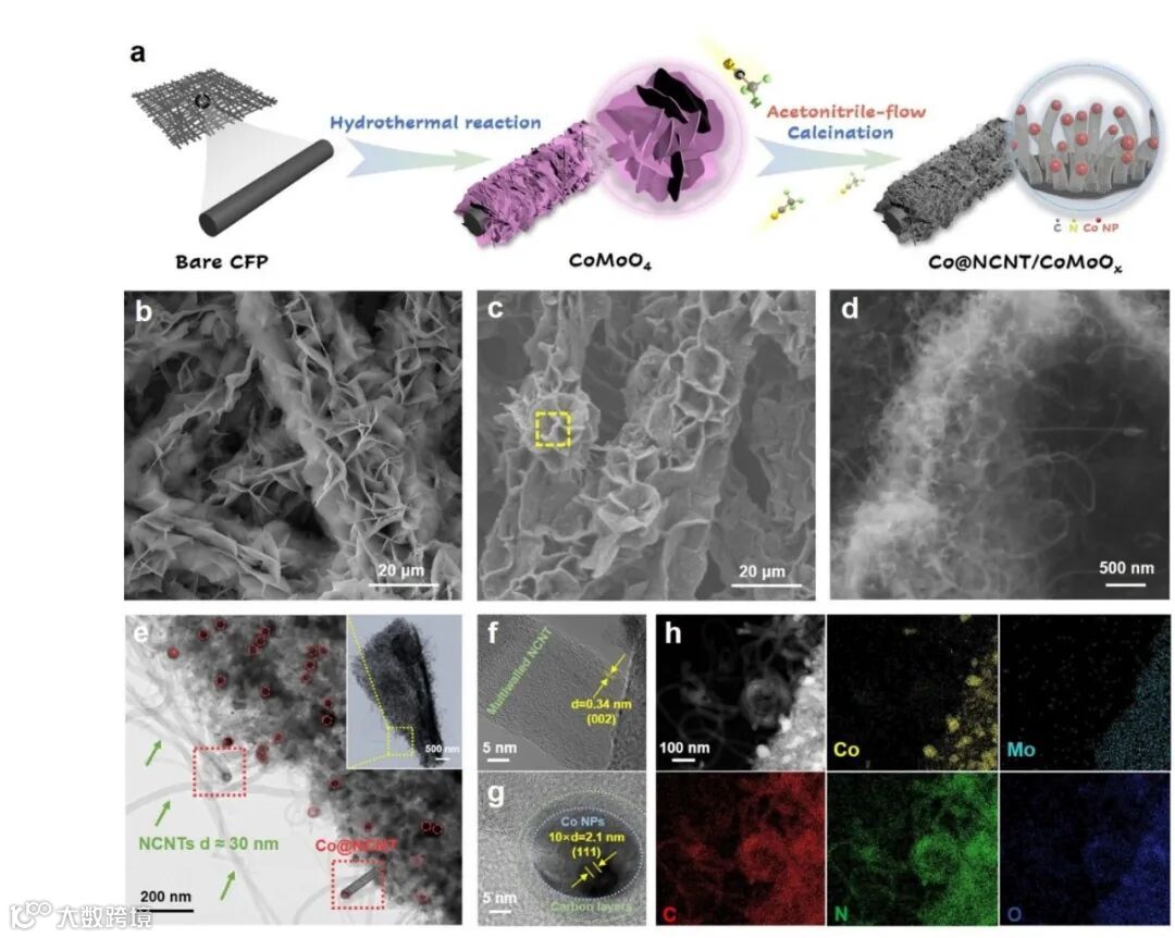 通过水热在碳纸上原位生长CoMoO4纳米片阵列,再通过液相助化学气相沉积法,在乙腈气氛下生成Co@NCNT/CoMoOx预催化剂。其中,乙腈作为氮掺杂碳纳米管的碳源和氮源,且具有还原作用使CoMoO4中的Co析出形成Co颗粒,通过尖端生长,形成了Co@NCNT阵列。该方法区别于传统的H2/Ar锻烧方法生成纳米管,更安全且简单可控。