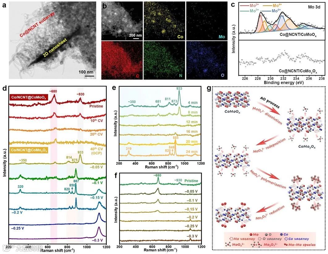 我们还对预催化剂Co@NCNT/CoMoOx在负电压下直接进行原位拉曼表征作为对比,发现只发生了MoO42−的缓慢析出,证明AO反应使MoO42−快速析出得到Co@NCNT/CoMoyOx更具稳定性并能捕捉后续的演化过程。其中,Co@NCNT纳米阵列能够在CoMoyOx外部保护整体异质结构完整稳定。