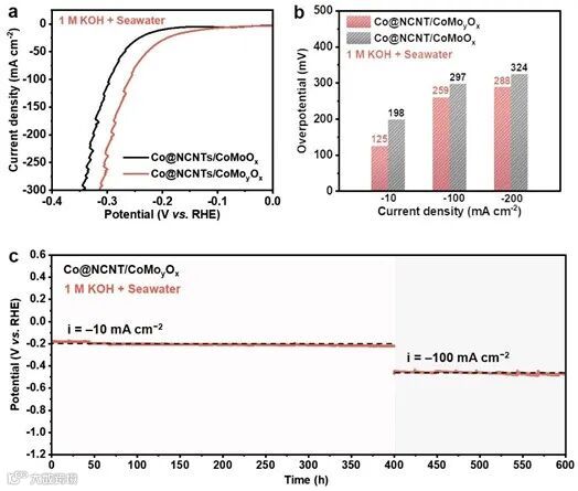 另外,Co@NCNT/CoMoyOx 在碱性海水中持续产氢600小时,包括在 −10 mA cm-2 工作400 小时,后在−100 mA cm-2的高电流密度下保持200 小时。