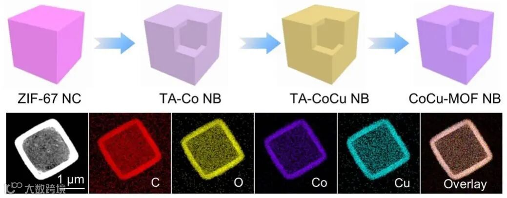 本文通过连续的阳离子和配体交换策略,可控合成了具有中空结构的钴铜基金属有机框架纳米盒。首先以钴基沸石咪唑骨架立方块作为初始的模板,通过单宁酸的刻蚀作用形成中空结构的单宁酸-钴配合物纳米盒
