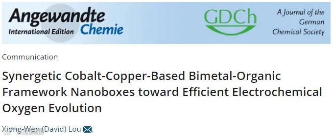 在这里,来自新加坡南洋理工大学的楼雄文教授团队,在国际知名期刊Angewandte Chemie International Edition上发表题为“Synergetic Cobalt-Copper-Based Bimetal-Organic Framework Nanoboxes toward Efficient Electrochemical Oxygen Evolution”的观点文章。