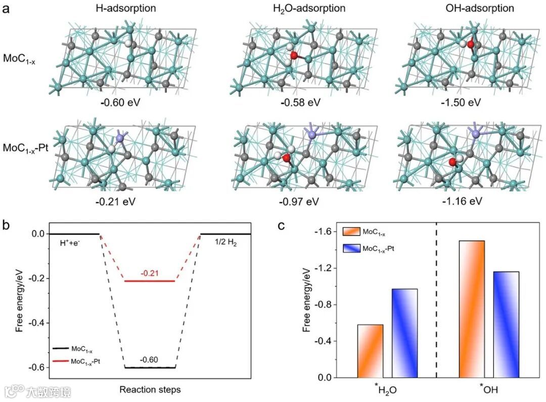 图5 DFT模拟反应物和中间体的吸附行为。a) 氢、水和氢氧化物在α-MoC1-x和α-MoC1-x-Pt表面的优化吸附几何结构。b) 氢在α-MoC1-x-Pt和α-MoC1-x-Pt表面吸附的吉布斯自由能图。c) α-MoC1-x和α-MoC1-x-Pt催化剂对水和氢氧化物的吸附自由能。(浅蓝色、灰色、紫色、红色和白色小球分别代表Mo、C、Pt、O和H)