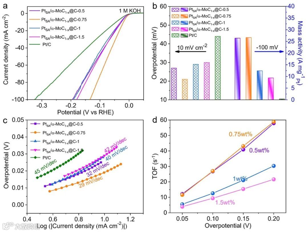 图3 碱性环境中PtSA/α-MoC1-x@C(x = 0, 0.5,0.75, 1.0,1.5wt%)催化剂的HER性能