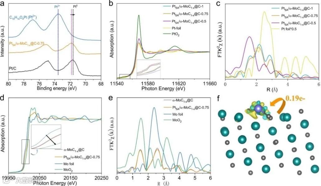 图2 Pt1/α-MoC1-x的电子结构表征。a) Pt 4f XPS光谱。b)Pt L3边XANES光谱(插图为边缘前峰的部分放大)。c)Pt L3边的FT-EXAFS曲线。d) Mo K边XANES谱。e)Mo K边的FT-EXAFS曲线。f) Pt1/α-MoC1-x的微分电荷密度(单位为0.007 e·Å-3,浅蓝色、灰色和紫色球分别代表Mo、C和Pt)