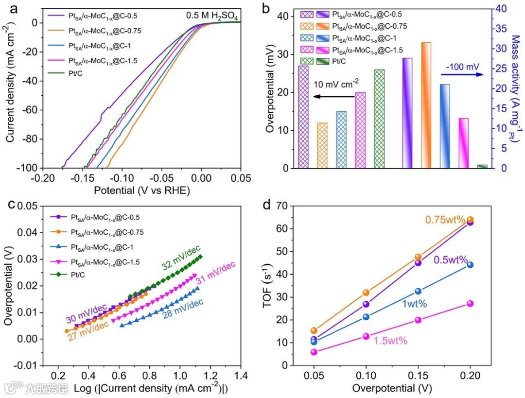图4 酸性环境中PtSA/α-MoC1-x@C(x = 0, 0.5,0.75, 1.0,1.5wt%)催化剂的HER性能