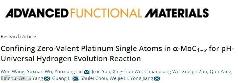 该研究成果以“Confining Zero-Valent Platinum Single Atoms in α-MoC1−x for pH-Universal Hydrogen Evolution Reaction”为题在国际著名期刊《Advanced Functional Materials》上在线发表。安徽大学为第一通讯单位,安徽大学2020级博士研究生王雯为第一作者,安徽大学林运祥博士、杨丽副教授、李广教授和北京科技大学姜勇教授为共同通讯作者。