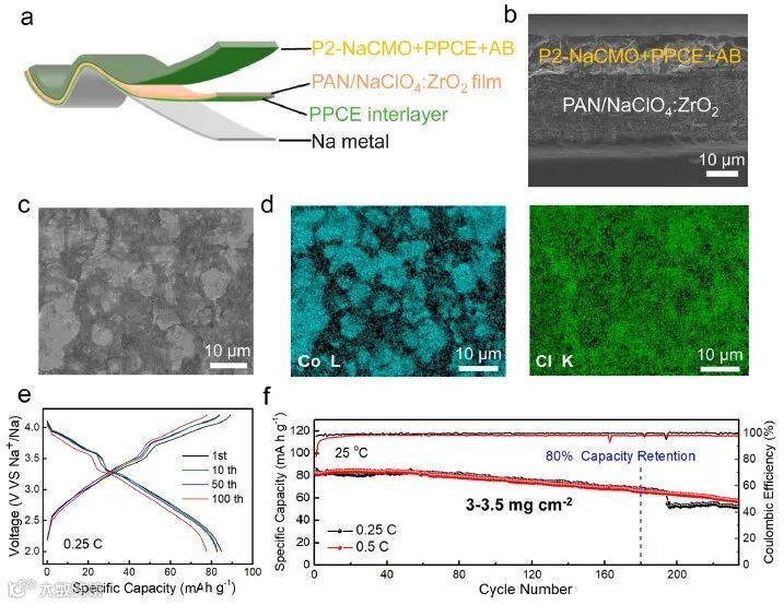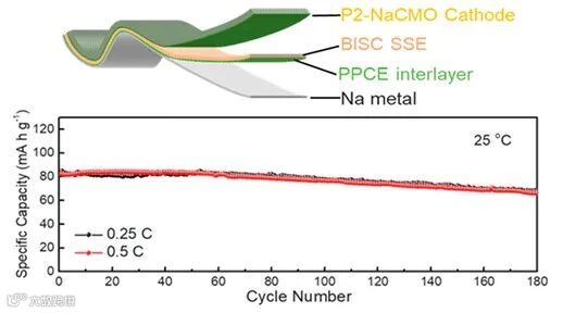 最后,该团队采用自主研发的P2相NaxCo0.7Mn0.3O2(x≈1.0,NaCMO)作为正极活性物质,PPCE以及乙炔黑分别作为离子和电子导电剂,并将上述混合物涂覆在BISC-Na+的一侧,并且将PPCE以及钠金属置于另一侧。所制备的全固态钠金属电池在室温下展现出极小的过电位,在0.25C的电流密度下可以稳定循环180周并且还有80%的容量保持率。