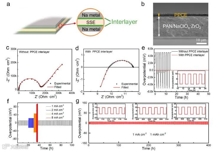 研究表明,用刮涂法在BISC-Na+涂覆一层2-3 μm的PPCE界面层后,对称电池的阻抗可以从159 kΩ·cm2降到1.6 Ω·cm2 。含有PPCE的钠对称电池具备出良好的倍率性能,在8 mA/cm2的电流密度下展现出极低的过电位, 而同时在 1 mA/cm2的电流密度,1 mAh/cm2的容量下也可以稳定循环400h,展现出良好的循环特性。