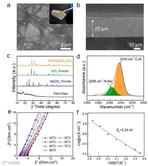 在本文中,该团队将聚丙烯腈(PAN)聚合物溶液进行电纺丝,同时将氧化锆(ZrO2)陶瓷悬浮液电喷到样品收集器上。然后将得到的PAN:ZrO2复合材料滚压成薄膜,并浸泡在高氯酸钠(NaClO4)的无水乙醇溶液中,然后在80 °C下真空干燥过夜,得到的BISC-Na+薄膜。