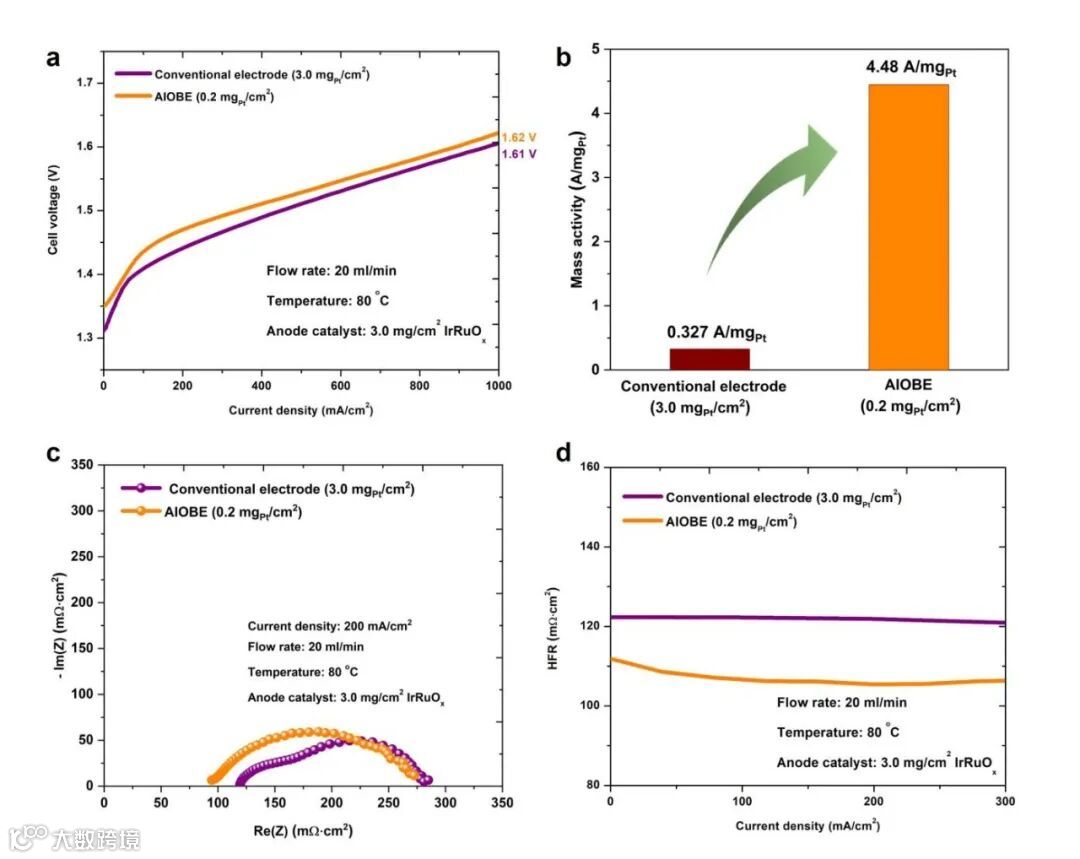 在PEMEC水电解池测试中发现AIOBE提供极低欧姆电阻(~0.1 ohm cm2),并在在1000 mA/cm2电流密度下实现极低的过电位(1.62V),其贵金属催化剂质量活性比传统电极高出14倍。