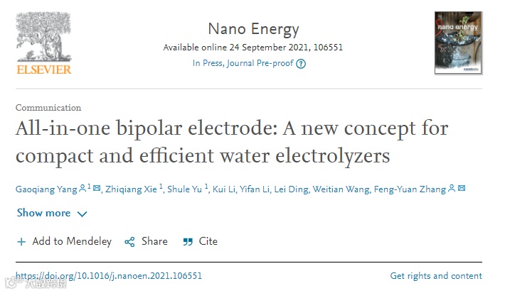 美国田纳西大学空间研究院张凤远教授科研团队采用先进制造技术(3D打印及金属沉积)开发出一体化(all-in-one)双极板电极(AIOBE),将除质子交换膜(PEM)外所有部件融合为一体,极大降低了水电解池部件加工工序、难度、电极催化剂载量及价格,并提升了水分解制氢的效率。研究成果近日发表在学术期刊《Nano Energy》上.