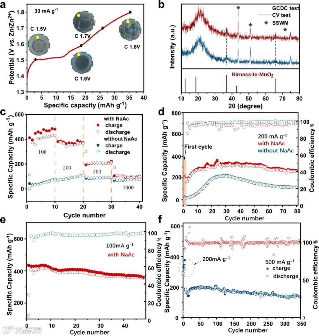 图 1. (a) 使用 ZnSO4 和 MnSO4 电解质在初始充电期间不同电压截止点的垫片光学照片。(b) GCDC 和 CV 测试后 SSWMs 的非原位 XRD。(c) 倍率性能和 (d) 在有或没有 NaAc 的电解质中在 200 mA g-1 下的循环稳定性。(e) NaAc 电解质中 100 mA g-1 的循环稳定性。(f) 在含有 NaAc 的电解质中,500 mA g-1 的长循环寿命。