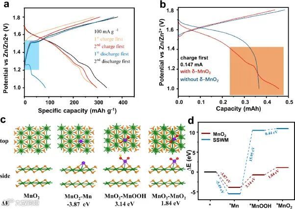 图3.(a) 先充与先放电充放电曲线对比。(b) 在有和没有 δ-MnO2 的情况下先充电的充放电曲线。(c) 几种锰物种的反应路径的几何构型和 (d) δ-MnO2 底物上反应能垒的 DFT 计算。