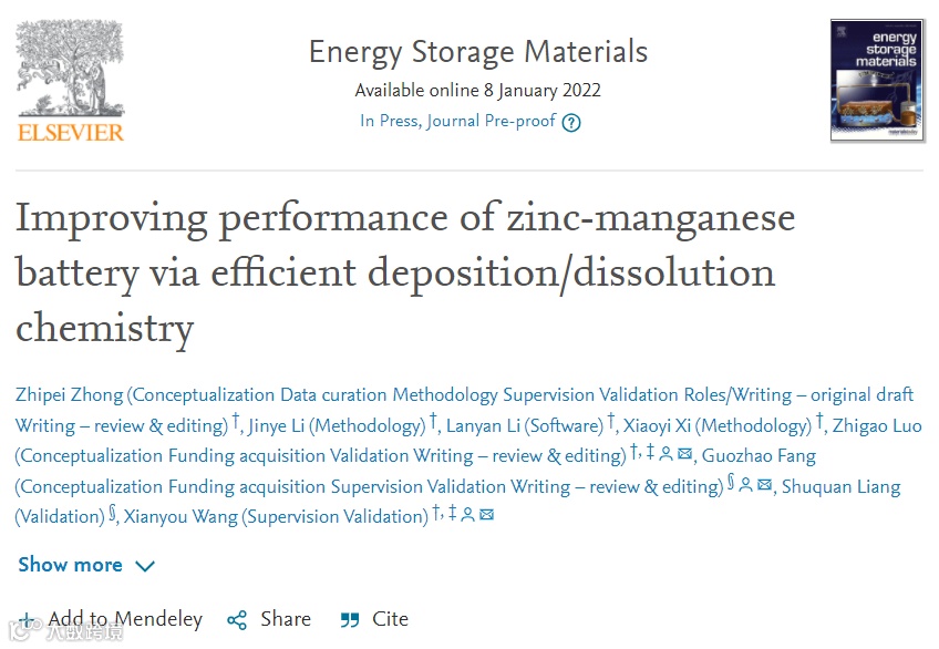 Zhipei Zhong, Jinye Li, Lanyan Li, Xiaoyi Xi, Zhigao Luo*, Guozhao Fang*, Shuquan Liang, Xianyou Wang*. Improving performance of zinc-manganese battery via efficient deposition/dissolution chemistry. Energy Stor. Mater.
