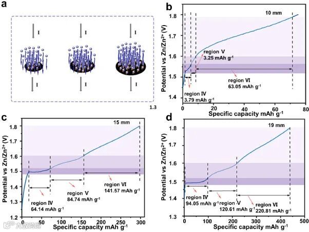 图4.(a) 不同面积集电器在恒电流下的沉积过程示意图。(b) 10 mm、(c) 15 mm 和 (d) 19 mm 直径的电极的电荷曲线划分和分析。