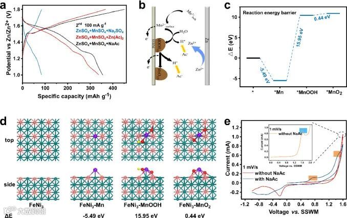 图2.(a) 有/无 Ac- 或 Na+ 电解质的比容量比较。(b) Mn2+ 沉积过程示意图。(c) 反应能垒的 DFT 计算和 (d) 几种锰物种在 SSWM 基板上的反应路径的几何构型。(e) 有或没有 NaAc 的电解质中 CV 曲线中的 Mn2+ 沉积。