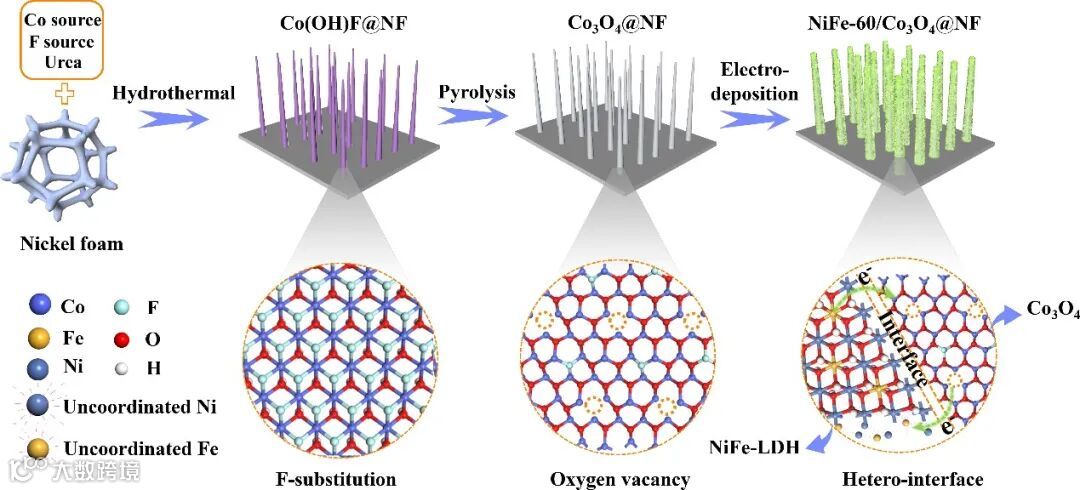 进一步,Co3O4中富集电子的氧空位(带正电荷)以游离的氢氧根离子(带负电)为桥梁,与NiFe-LDH无定形区域内高能量、高价态的Fe3+产生电子耦合效果,实现电子回溯,完成材料电子结构的优化。