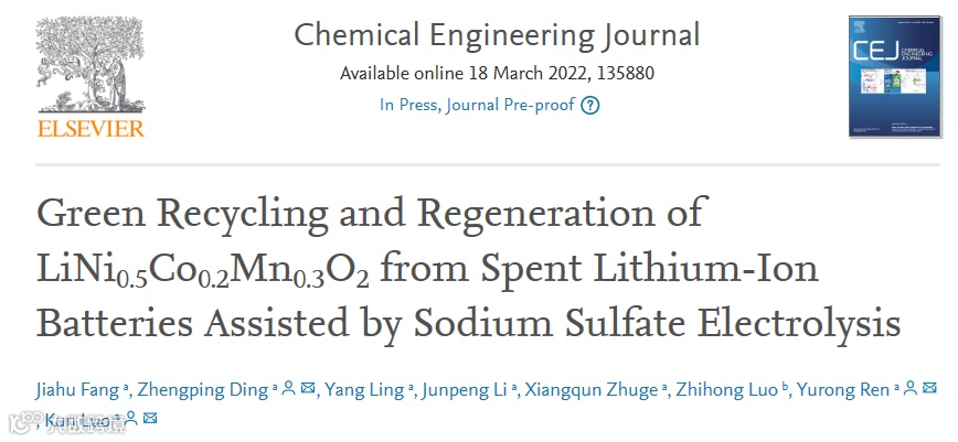 基于此,常州大学罗鲲教授课题组在Chemical Engineering Journal上发表题为“Green recycling and regeneration of LiNi0.5Co0.2Mn0.3O2 from spent lithium-ion batteries assisted by sodium sulfate electrolysis”的研究论文。