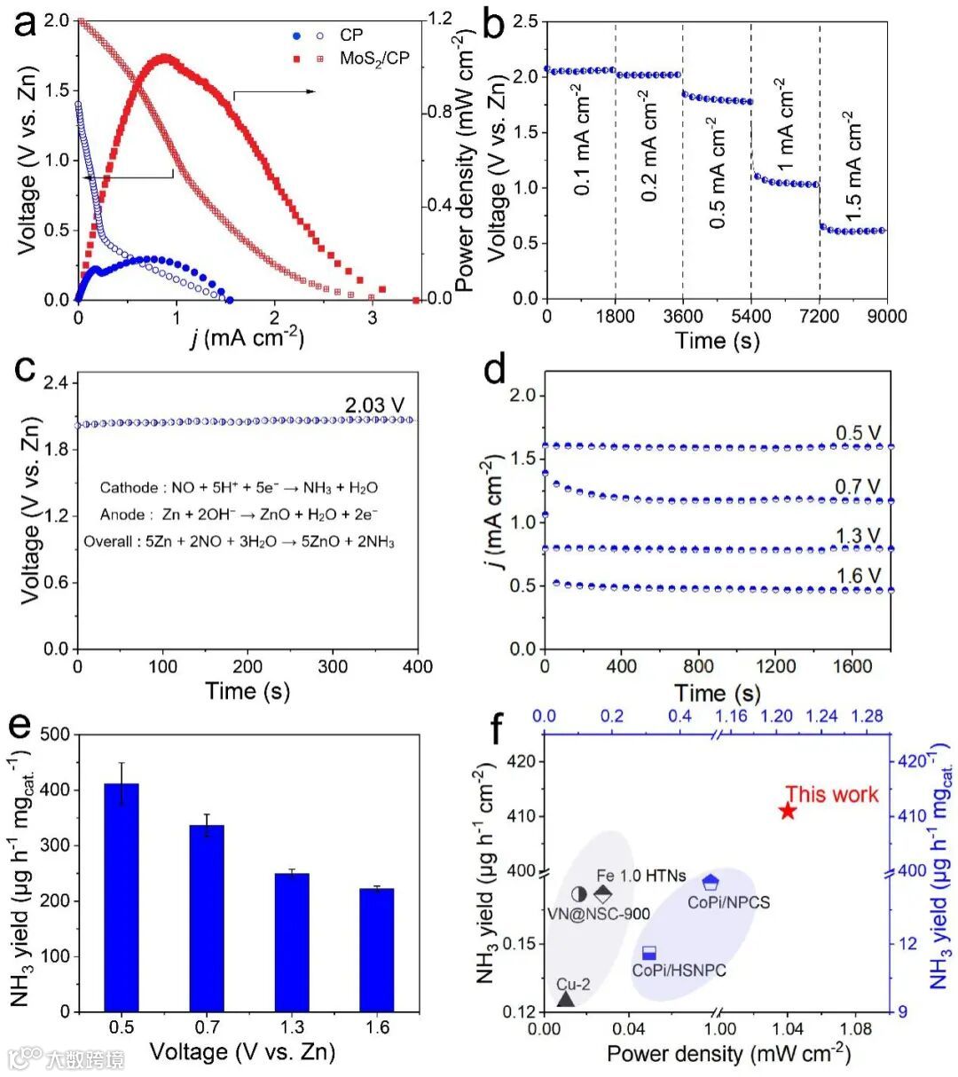 此外,受到锌空气电池的启发,该工作利用MoS2作为催化电极首次开发了一种锌-一氧化氮(Zn-NO)电池系统,该电池具有同时合成氨和对外供电的功能,其功率密度为1.04 mW cm-2,氨产率为411.8 µg h−1 mgcat.−1。