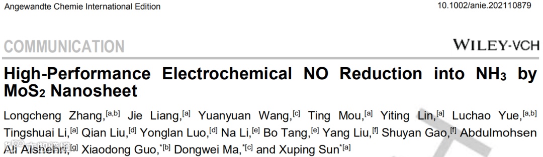 本文中,电子科技大学的孙旭平教授、四川大学的郭孝东教授和河南大学的马东伟教授合作,在国际知名期刊Angewandte Chemie International Edition上发表题为“High-Performance Electrochemical NO Reduction into NH3 by MoS2 Nanosheet”的文章。