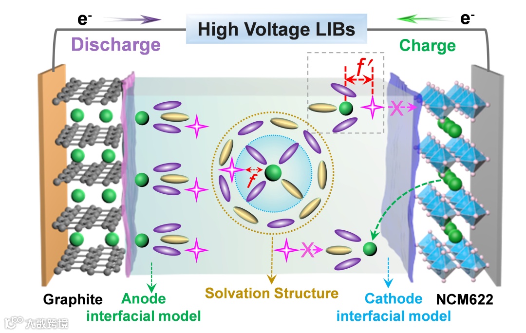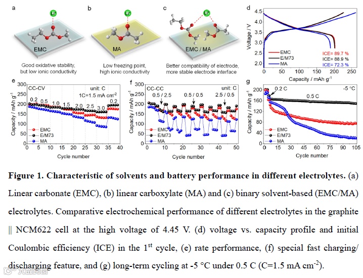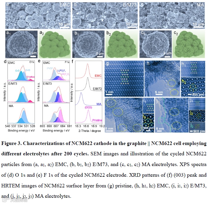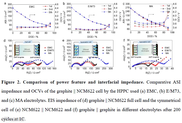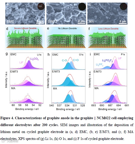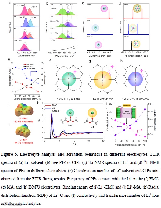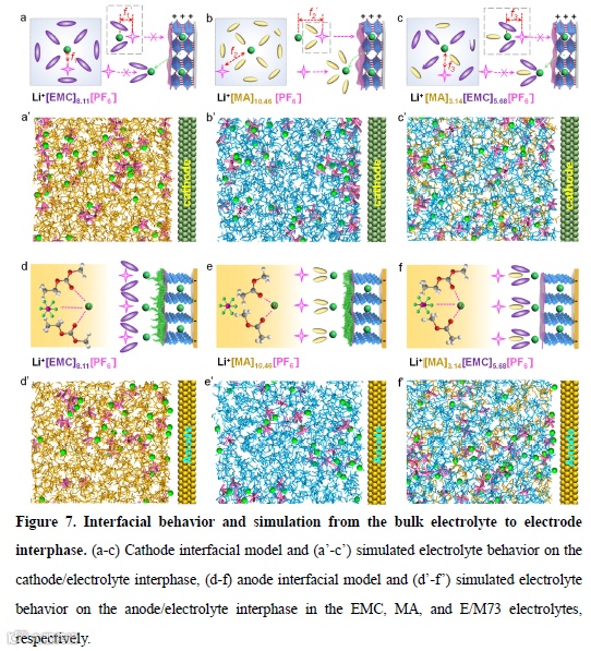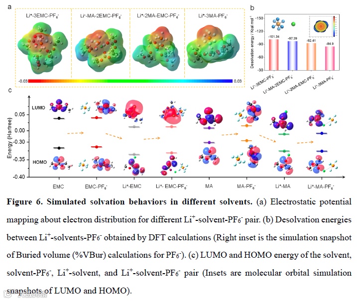 首先,在EMC电解液中,PF6-更容易出现在Li+-EMC周围,使得Li+与EMC-PF6-之间存在强大的相互作用力,会削弱PF6-与充电正极之间的库伦相互作用力(图7a),因此,EMC-PF6-很难靠近正极表面,从而难以发生氧化反应。