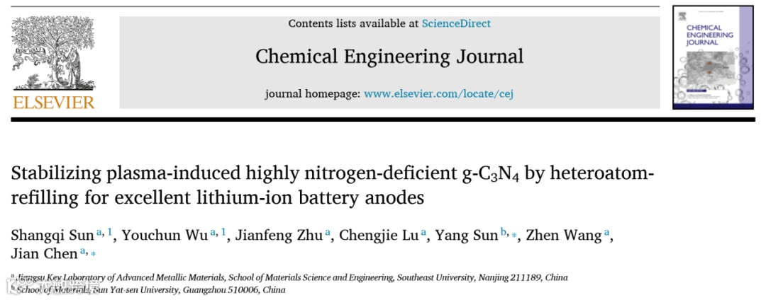 基于此,来自东南大学的陈坚教授与中山大学孙洋副教授合作,在国际知名期刊Chemical Engineering Journal上发表题为“Stabilizing plasma-induced highly nitrogen-deficient g-C3N4 by heteroatom-refilling for excellent lithium-ion battery anodes”的观点文章。
