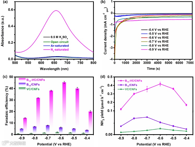 图4(a)在不同条件下,B11-VC/CNFs的紫外-可见吸收光谱;(b)在一系列电位下,B11-VC/CNFs的计时电流密度曲线(c-d)在一系列电位下,B11/CNFs、VC/CNFs和B11-VC/CNFs的NH3产率和法拉第效率。