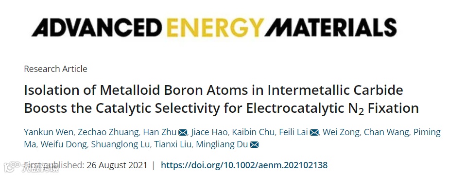 近日,江南大学朱罕副研究员、杜明亮教授和比利时鲁汶大学赖飞立博士在国际期刊Advanced Energy Materials(影响因子:29.368)上发表题为:“Isolation of Metalloid Boron Atoms in Intermetallic Carbide Boosts the Catalytic Selectivity for Electrocatalytic N2 Fixation”的研究工作。该工作结合静电纺丝工艺和固相反应制备了一系列B/CNFs和B-VC/CNFs催化剂材料。通过调控前驱体中B的含量,制备的B11-VC/CNFs具有较高的法拉第效率(46.1 %)和氨产率(0.443 μmol h-1 cm-2)。文章在实验上研究了金属间化合物隔离单B位点对于硼基材料eNRR性能的影响,在理论上结合DFT揭示了金属间化合物隔离的单B活性位点与eNRR性能之间的构效关系。