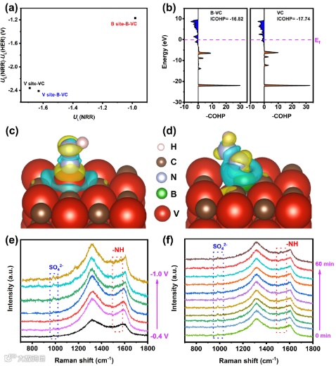 图6(a)不同活性位点的UL(NRR) − UL(HER) vs UL(NRR)的图;(b)吸附的N原子在VC以及B-VC模型的晶体轨道哈密顿布居;(c-d)VC以及B-VC模型上吸附的NNH*的电荷密度;(e-f)B11-VC/CNFs在N2氛围下的原位拉曼光谱。